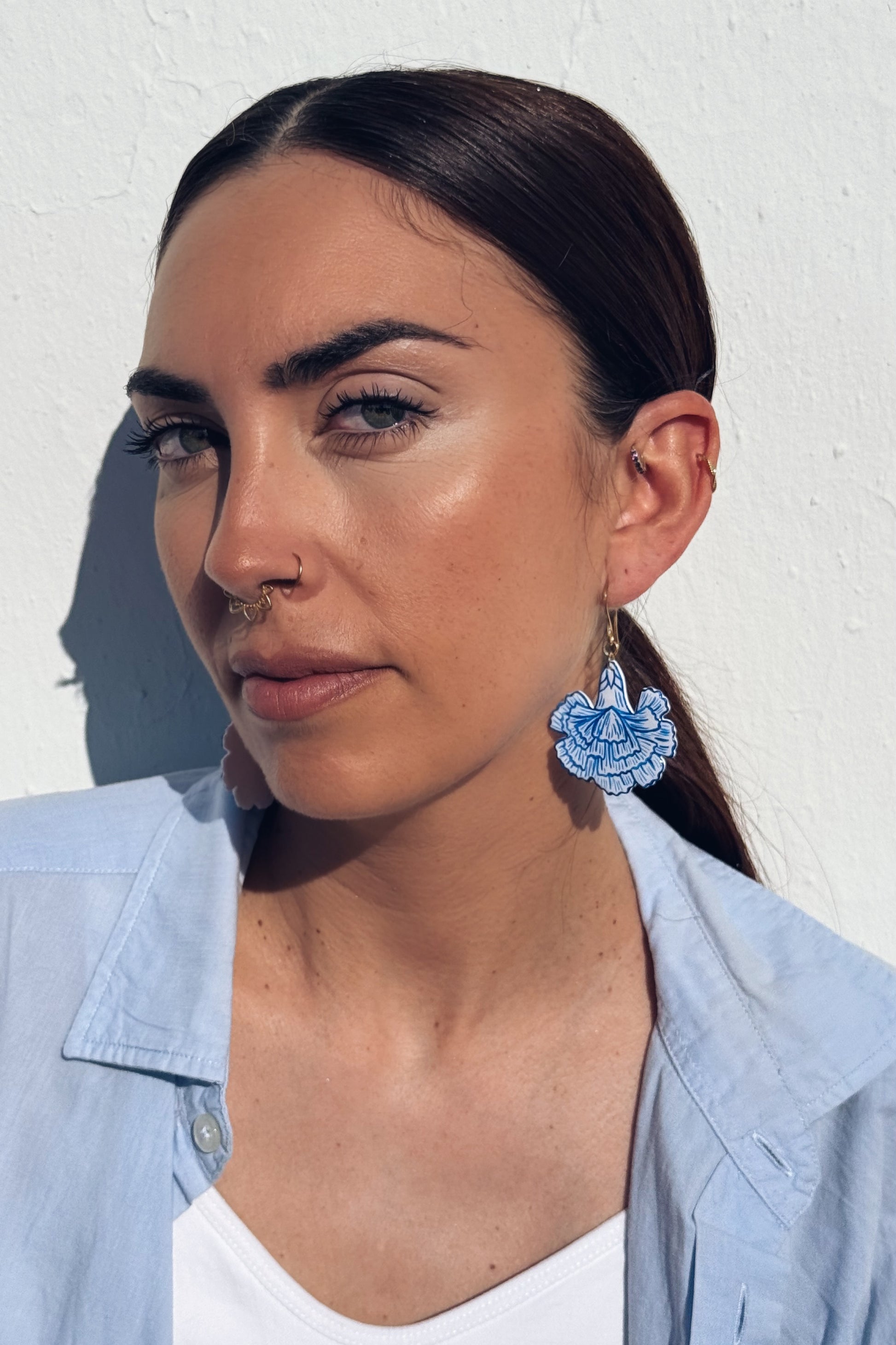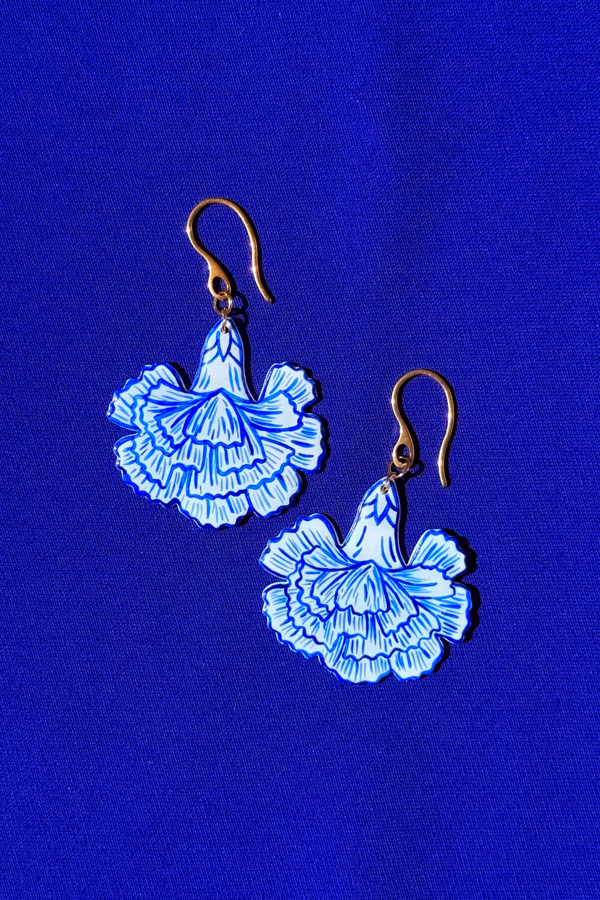 Pendientes con forma de clavel artesanales elaborados con arcilla polimérica y engarces de acero inoxidable.