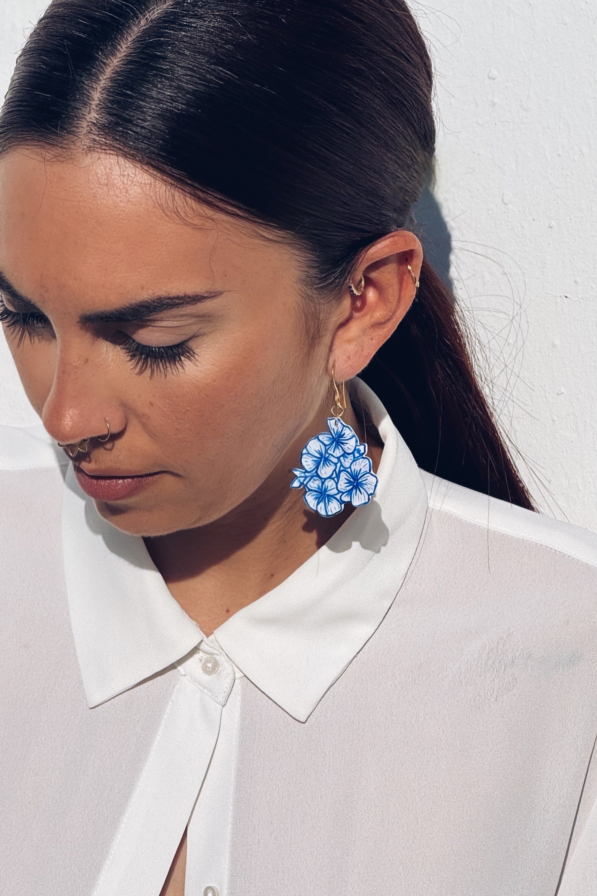 Pendientes de ramillete de flor del geranio. Modelados en arcilla polimerica y pintados a mano. Engarce de acero inoxidable.